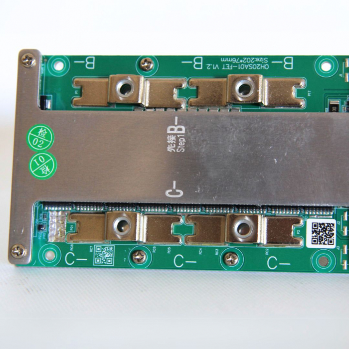 The intelligent BMS (battery management system) acts as a protection circuit specifically designed for strings of 8 to 20 LiFePO4 battery cells. The BMS includes a balancer that effectively adjusts the voltage of each cell. The BMS hardware is embedded between two aluminum alloy plates that provide good heat dissipation in addition to physical protection.